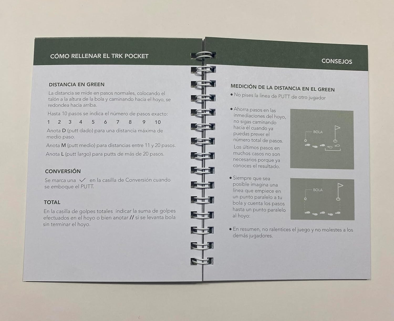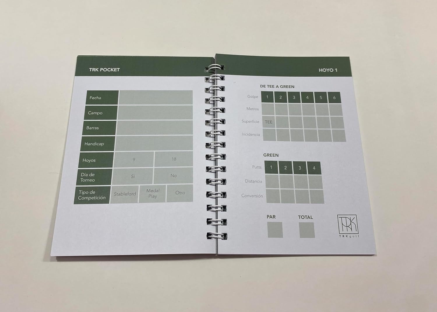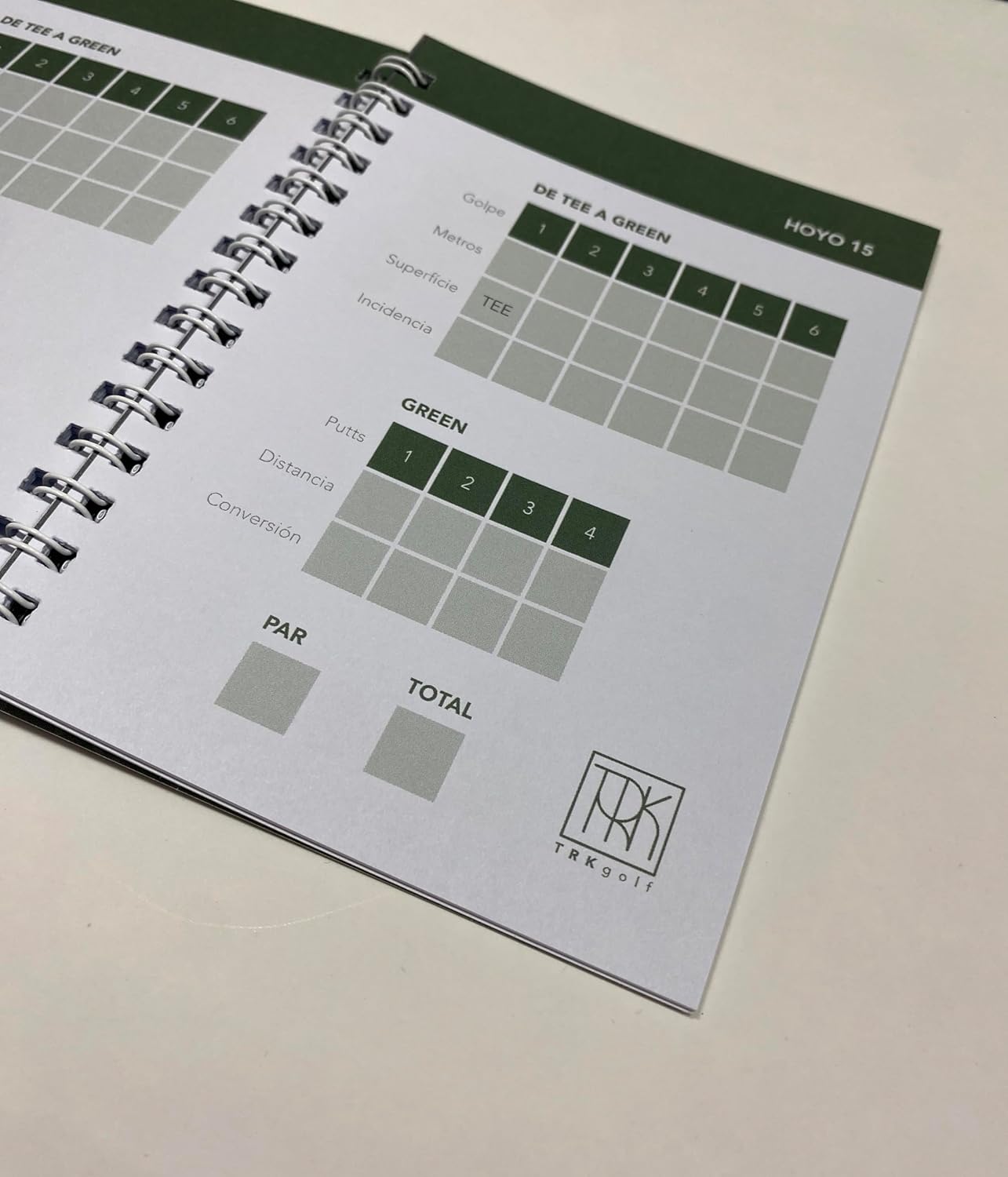 Dos unidades de TRK Pocket. Totalmente en español, ligero y cómodo de usar. Cada TRK Pocket está diseñado para registrar fácilmente cada golpe que hagas de dos rondas completas de golf. Incluye instrucciones sencillas para el registro de golpes usando la nomenclatura del sistema TRK que es el mismo que encontrarás en la Aplicación web de TRK Golf; cuenta con espacio para anotar los datos del día del partido y para tomar tus notas sobre el terreno. Muy ágil y rápido de usar. Tamaño práctico de bolsillo con papel de calidad Usomano – (PEFC) con 120 de gramaje, grosor que permite la escritura firme, impide que se rasgue el papel y facilita el paso de página. Cubierta resistente y duradera para proteger las páginas del desgaste por el uso.