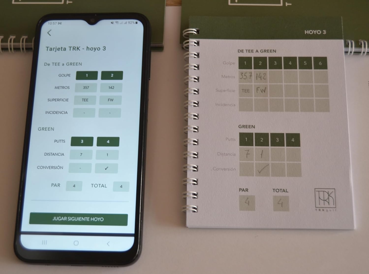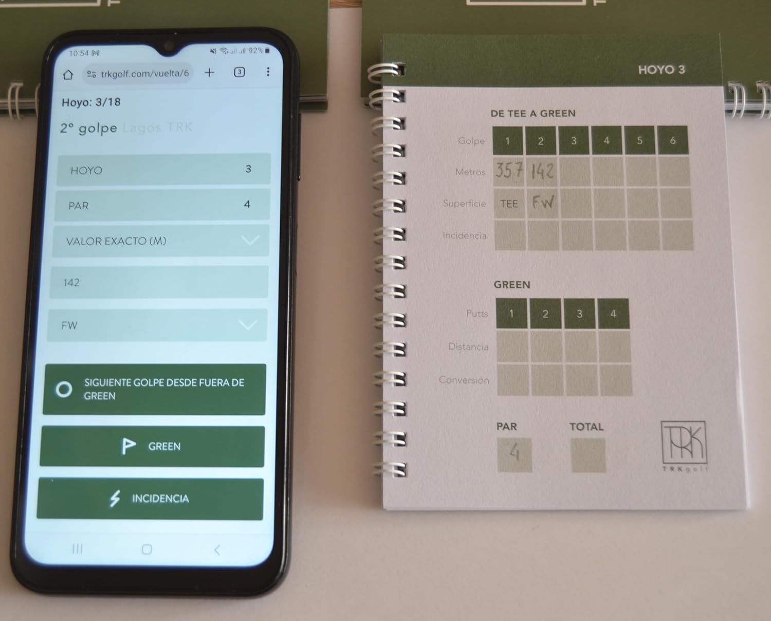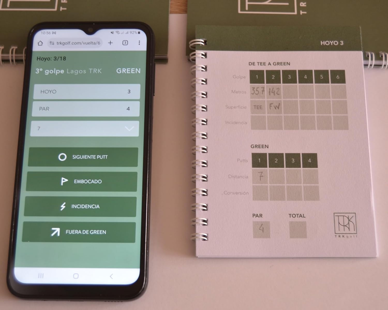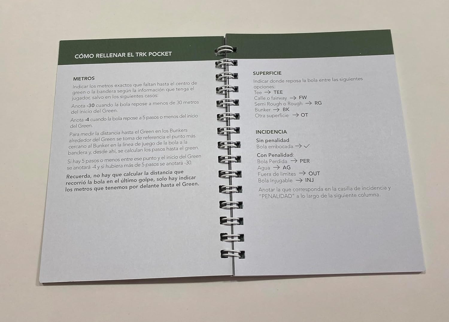 Dos unidades de TRK Pocket. Totalmente en español, ligero y cómodo de usar. Cada TRK Pocket está diseñado para registrar fácilmente cada golpe que hagas de dos rondas completas de golf. Incluye instrucciones sencillas para el registro de golpes usando la nomenclatura del sistema TRK que es el mismo que encontrarás en la Aplicación web de TRK Golf; cuenta con espacio para anotar los datos del día del partido y para tomar tus notas sobre el terreno. Muy ágil y rápido de usar. Tamaño práctico de bolsillo con papel de calidad Usomano – (PEFC) con 120 de gramaje, grosor que permite la escritura firme, impide que se rasgue el papel y facilita el paso de página. Cubierta resistente y duradera para proteger las páginas del desgaste por el uso.